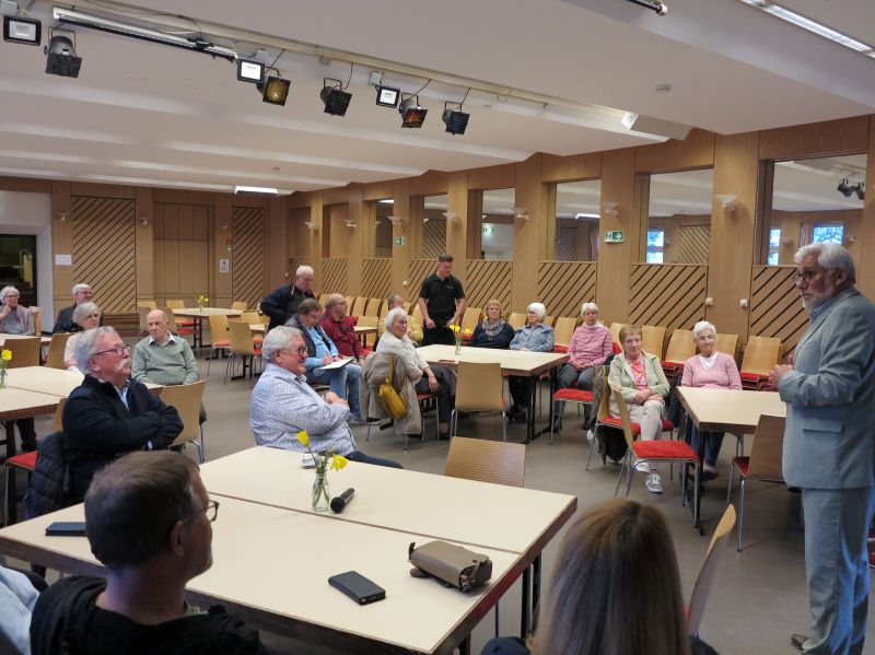 In einer lebendigen und anschaulichen Präsentation schilderte er den langen Weg der Juden vom schlecht beleumundeten Hausierer und Geldverleiher hin zu angesehenen Kaufleuten, Händlern und gutsituierten Bürgern in der Mitte der Gesellschaft Ende des 19. Jahrhunderts, bis der Völkermord der 1933 an die Macht gekommenen Nationalsozialisten die Juden und deren Kultur in Deutschland und Westeuropa fast vollständig auslöschte. Erst mit Zerfall der Sowjetunion 1991 und die Rückkehr der überwiegend jüdischen Osteuropäer wuchsen die kleinen jüdischen Gemeinden rasant an, was diese vor große Herausforderungen im Hinblick auf Integration der neuen Gemeindemitglieder stellte.