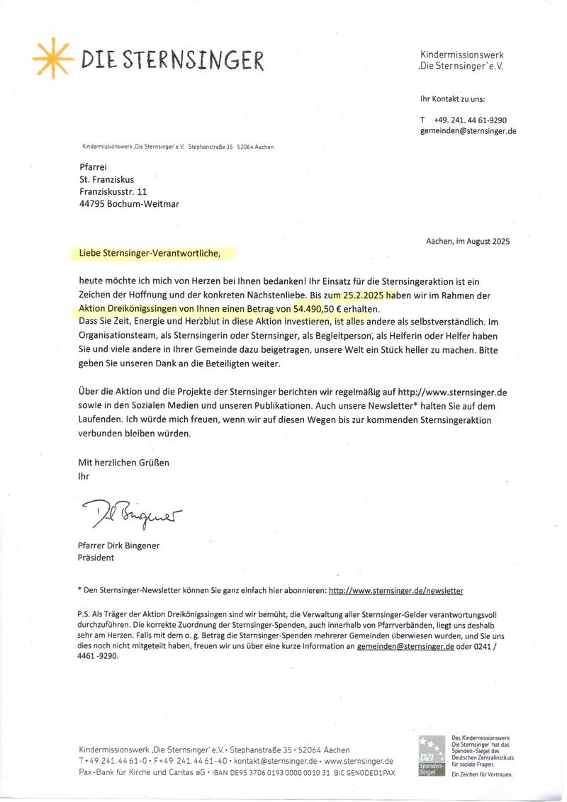 Danksagung des Kindermissionswerks an die Pfarrei St. Franziskus