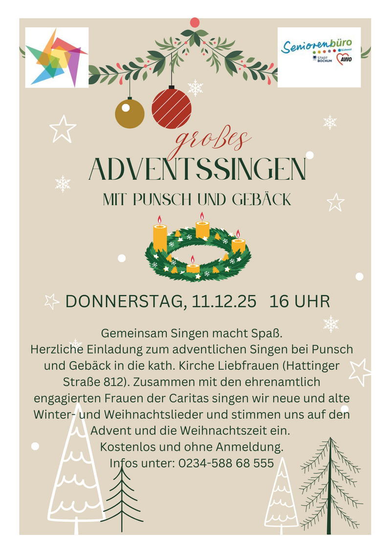 Im Dezember 2024 haben wir zusammen mit dem Seniorenbüro Südwest wieder zu einem gemeinsamen offenen Singen eingeladen. Rund hundert Menschen sind dieser Einladung in die Kirche gefolgt und haben kräftig eingestimmt in Advents- und Winterlieder. Da unser Singen am Tag der heiligen Barbara stattfand, haben wir mit Kirschbaumzweigen an sie erinnert. Stimmungsvolle Geschichten und Gedichte rundeten das vorweihnachtliche Programm ab. In der Pause kamen wir bei Punsch und Gebäck miteinander ins Gespräch.