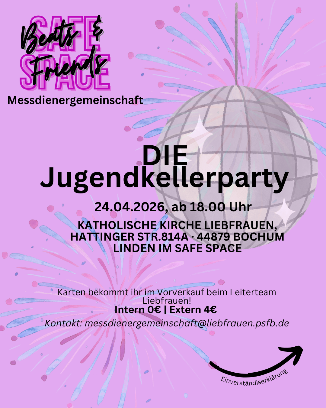 Am Freitag den 24.04.2026 findet die erste Jugendparty in den neu gestalteten Jugendräumen statt. Das Leiterteam der Messdiener freut sich auf einen Abend mit Freunden, Musik und ganz viel Spaß mit euch!