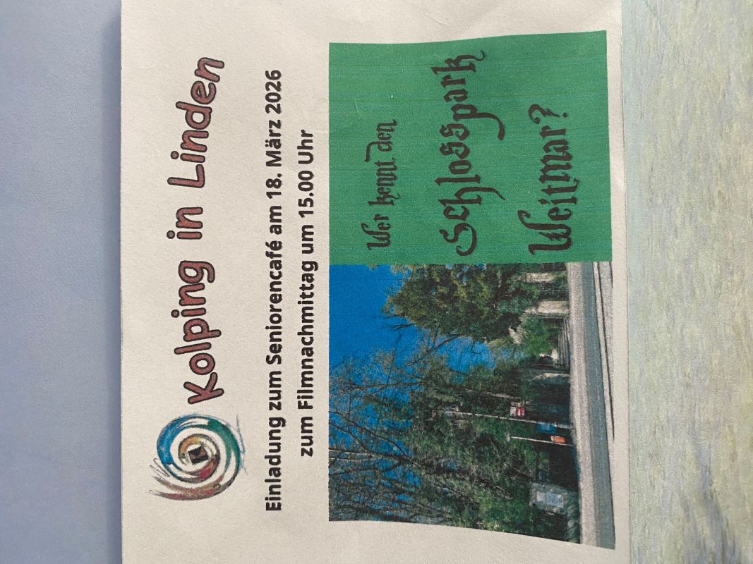 Die Kolpingsfamilie Bochum-Linden lädt zu einem gemütlichen Filmnachmittag bei Kaffee und Kuchen in den Katecheseraum (EG) des Gemeindezentrums Liebfrauen ein. Das Thema lautet: "Wer kennt den Schlosspark Weitmar?". Moderator ist Manfred Bucher.